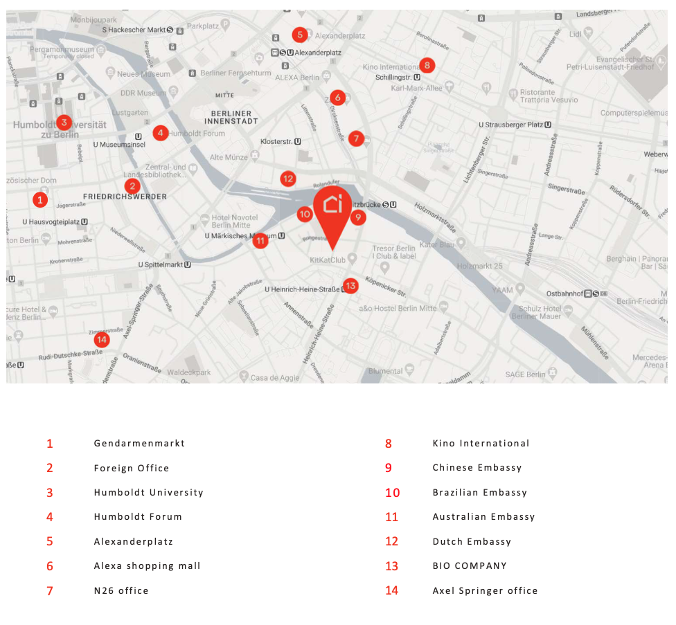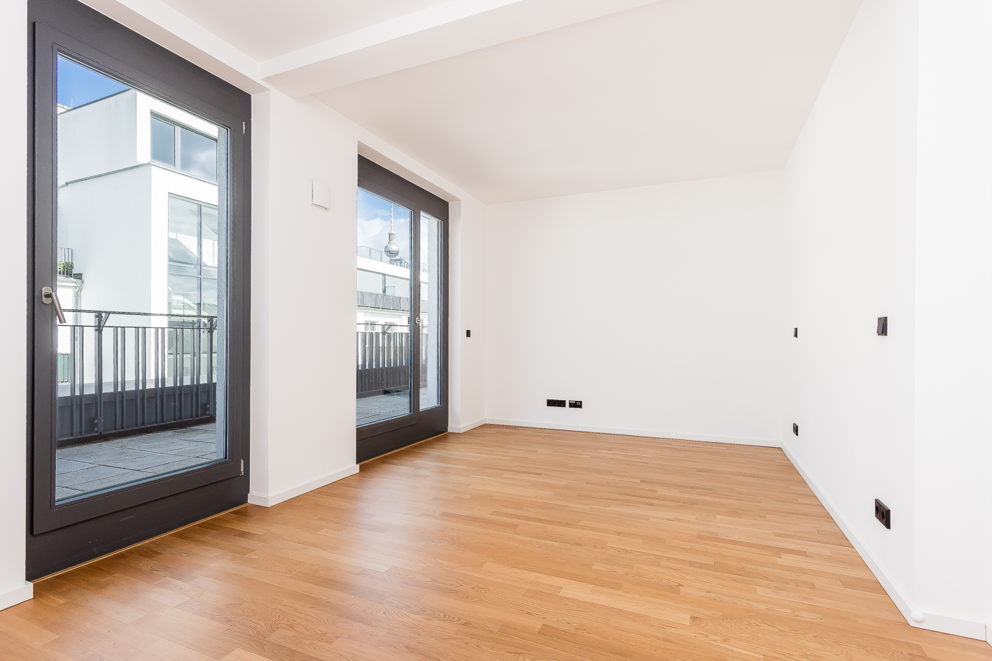 The penthouse is located not far from the Spree in a quiet but central corner of Mitte. Not coincidentally, the area is popular with embassies (including China, Brazil, Australia and the Netherlands) and several large tech employers such as N26 have their offices nearby. A BIO COMPANY supermarket is only 3 minutes away and transport links are unbeatable: the U8 (Heinrich-Heine-Straße), the U2 (Märkisches Museum) and the Jannowitzbrücke S-Bahn station (S3, S5, S7, S9) are all just a 5 minutes’ walk away.