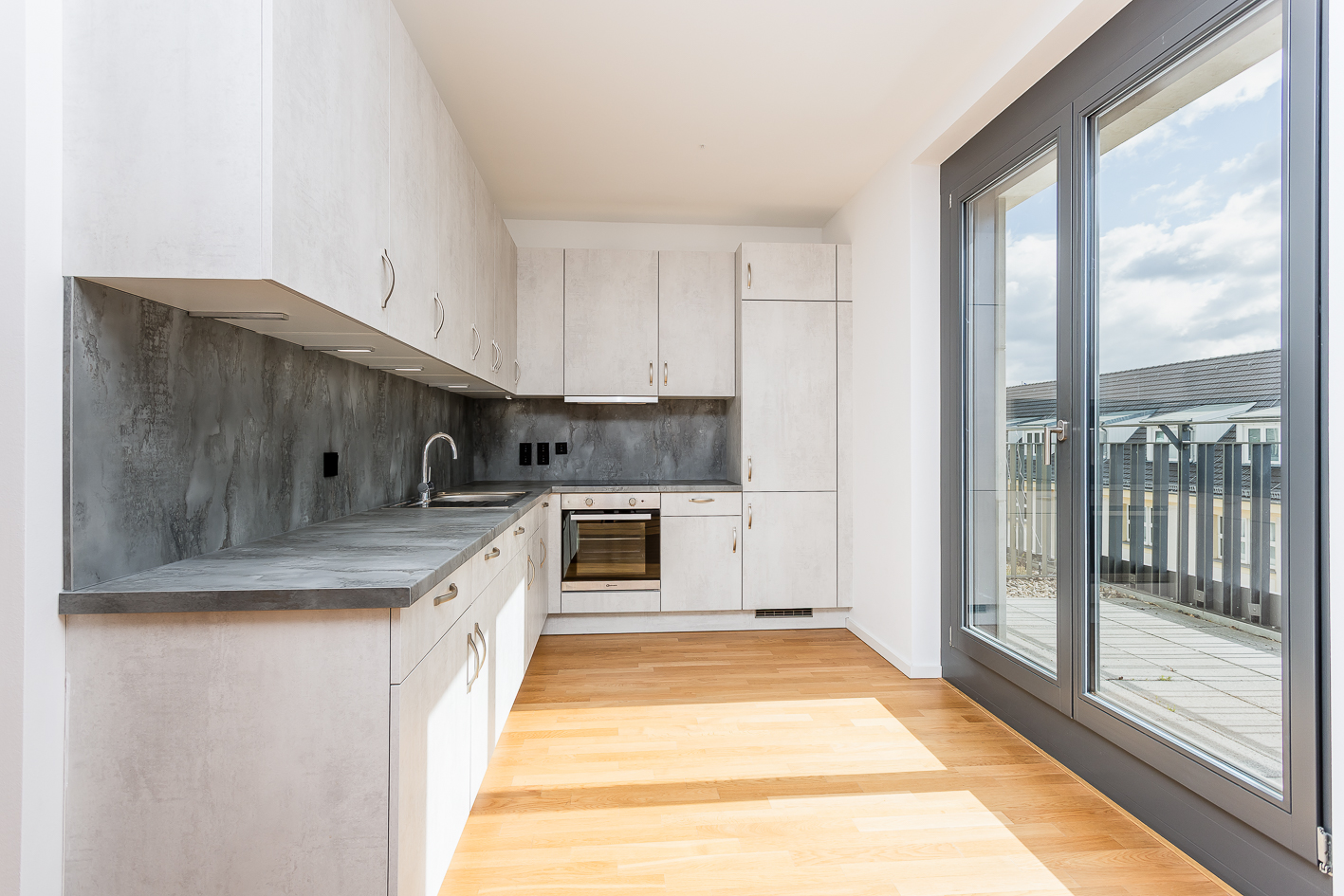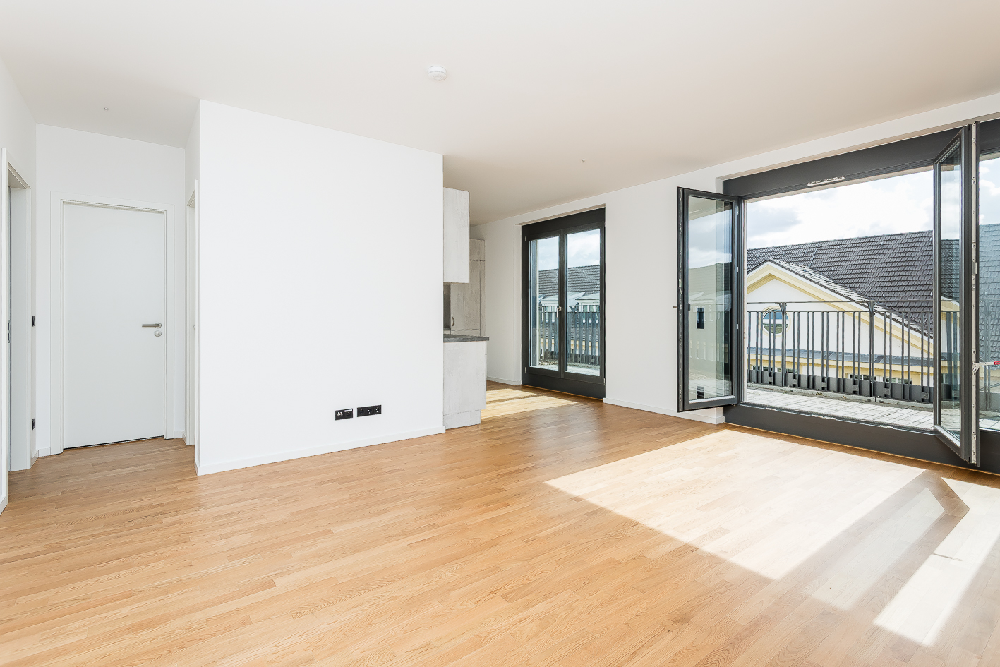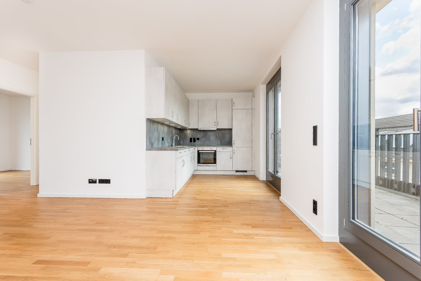 The apartment’s floor plan is suitable for a single person, a couple or even a co-living concept (e.g. young professionals flatshare). The hallway area with space for a wardrobe provides access to a 32 m² living-dining room with fitted kitchen and floor-to-ceiling windows leading to the breakfast terrace on the east side. In addition, there is also a 19 m² master bedroom and another 13 m² room (study/bedroom). Both rooms open up to the west-facing terrace (evening sun).
