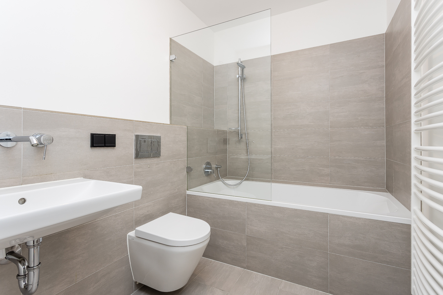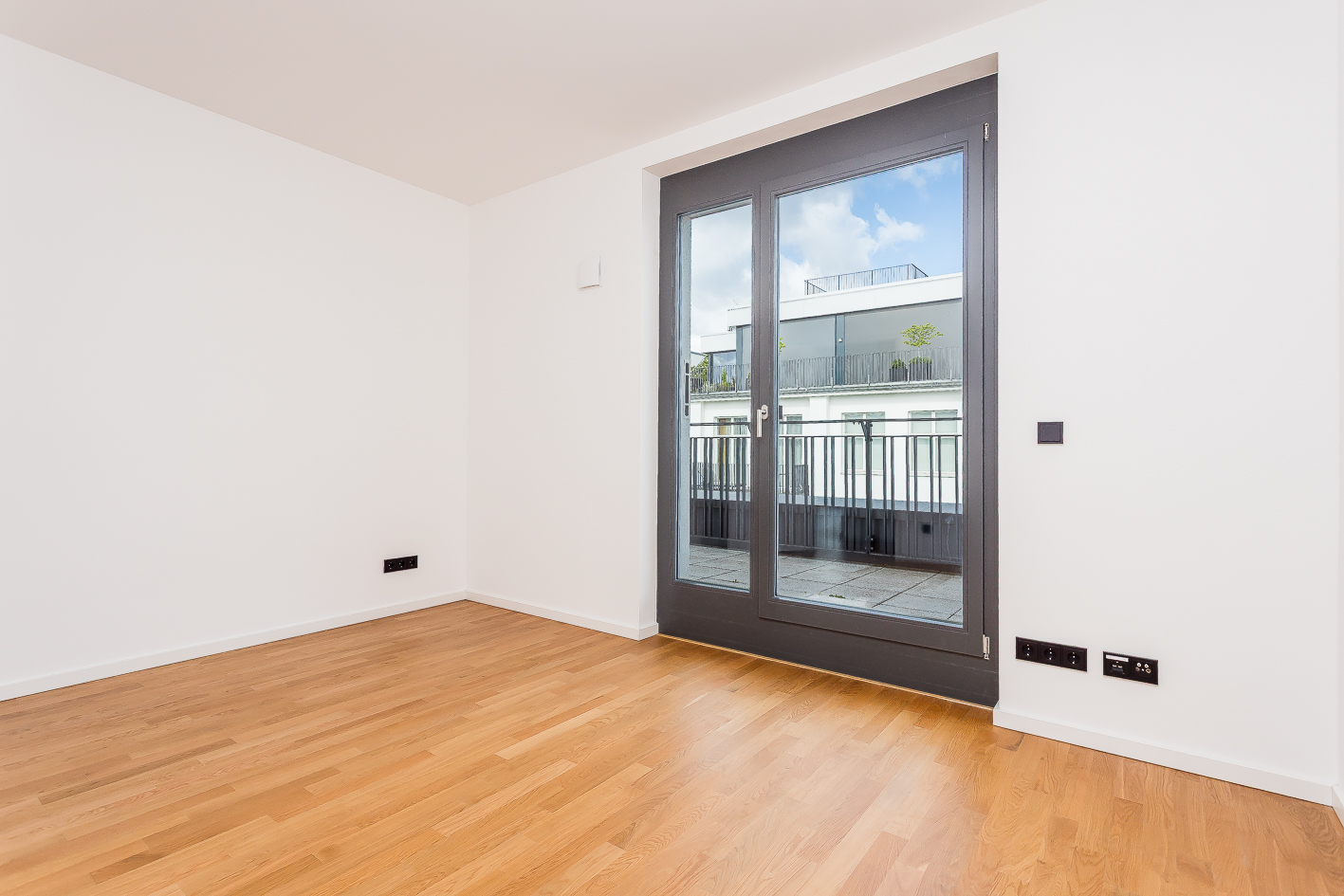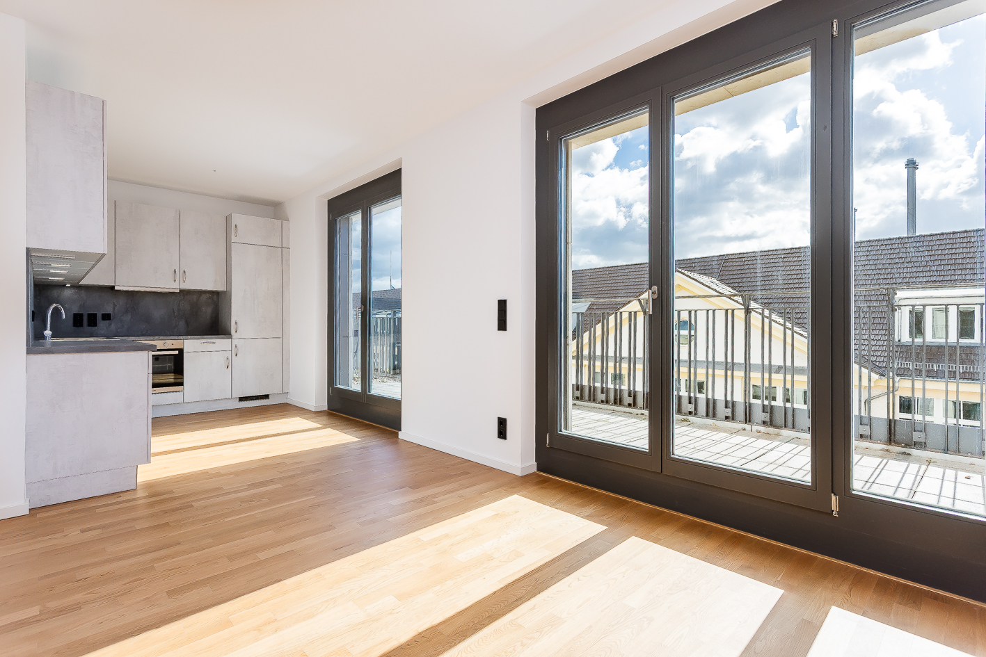 The apartment’s floor plan is suitable for a single person, a couple or even a co-living concept (e.g. young professionals flatshare). The hallway area with space for a wardrobe provides access to a 32 m² living-dining room with fitted kitchen and floor-to-ceiling windows leading to the breakfast terrace on the east side. In addition, there is also a 19 m² master bedroom and another 13 m² room (study/bedroom). Both rooms open up to the west-facing terrace (evening sun).