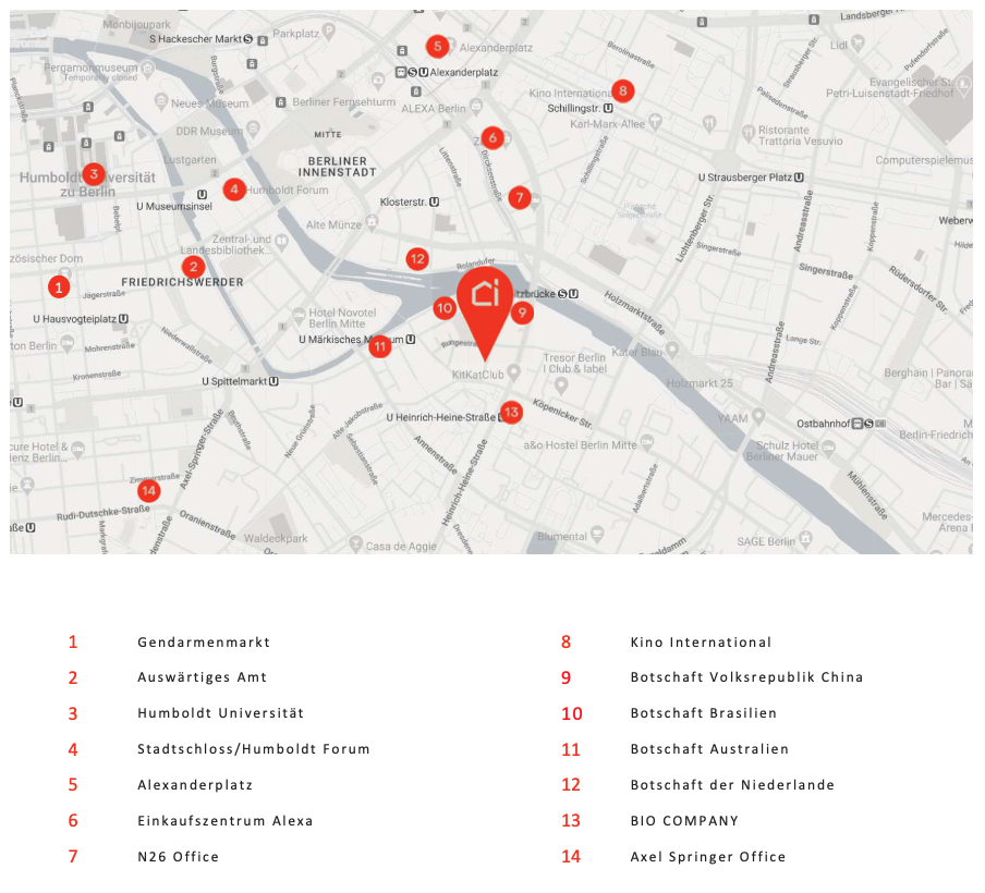 Das Penthouse befindet sich unweit von der Spree in einer ruhigen aber zentralen Ecke von Mitte. Nicht zufällig ist das Viertel bei Botschaften beliebt (u.a. China, Brasilien, Australien, Niederlande) und auch einige große Tech-Arbeitgeber wie N26 haben Ihre Büros in der Nähe. Ein BIO COMPANY Supermarkt ist nur 3 Minuten entfernt und die Anbindung ist unschlagbar: in 5 Gehminuten gibt es die U8 (Heinrich-Heine-Straße), die U2 (Märkisches Museum) und der S-Bahnhof Jannowitzbrücke (S3, S5, S7, S9).